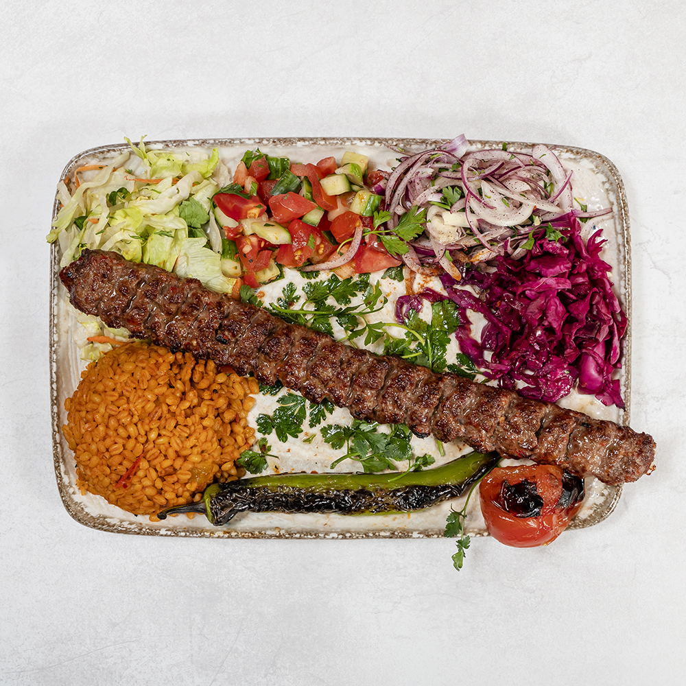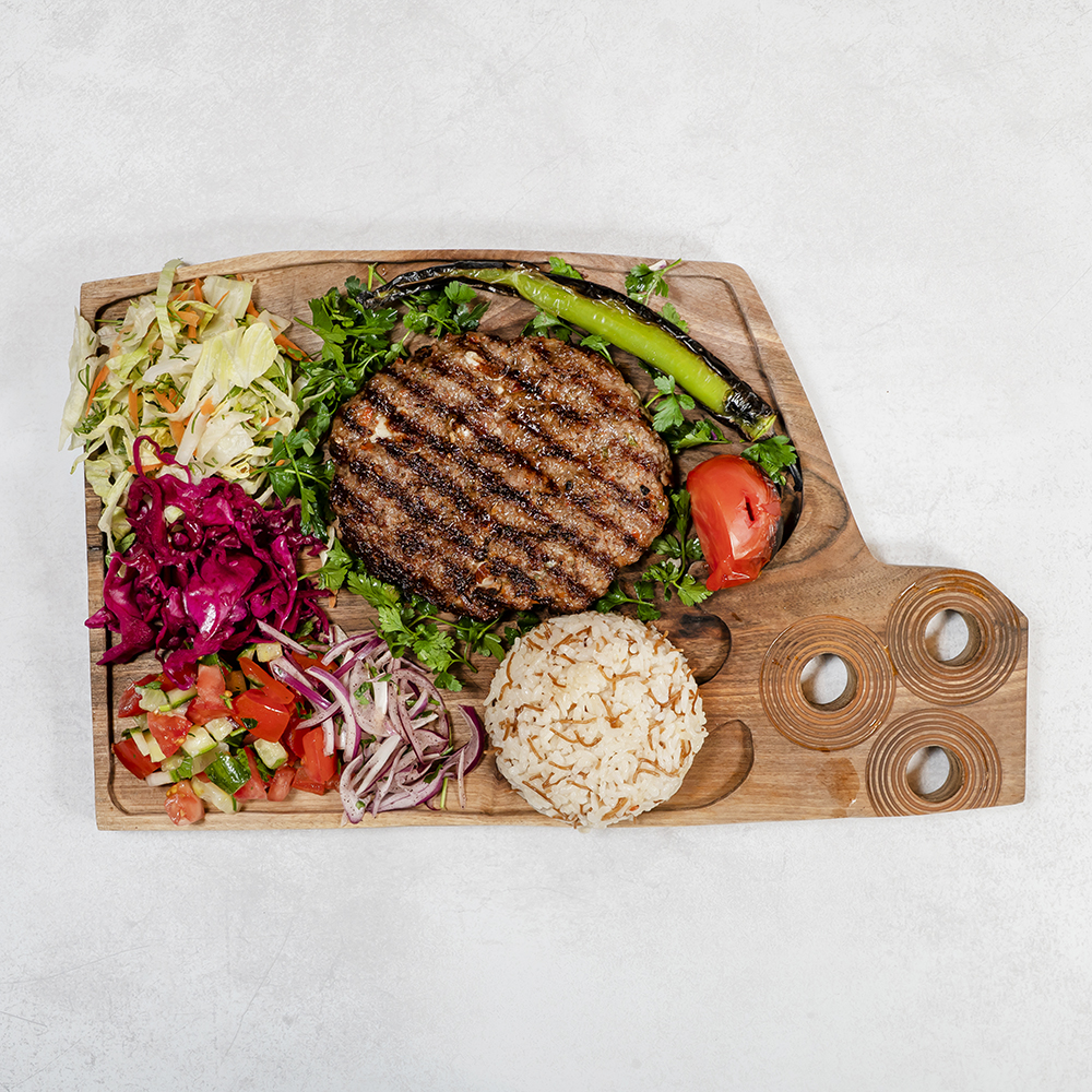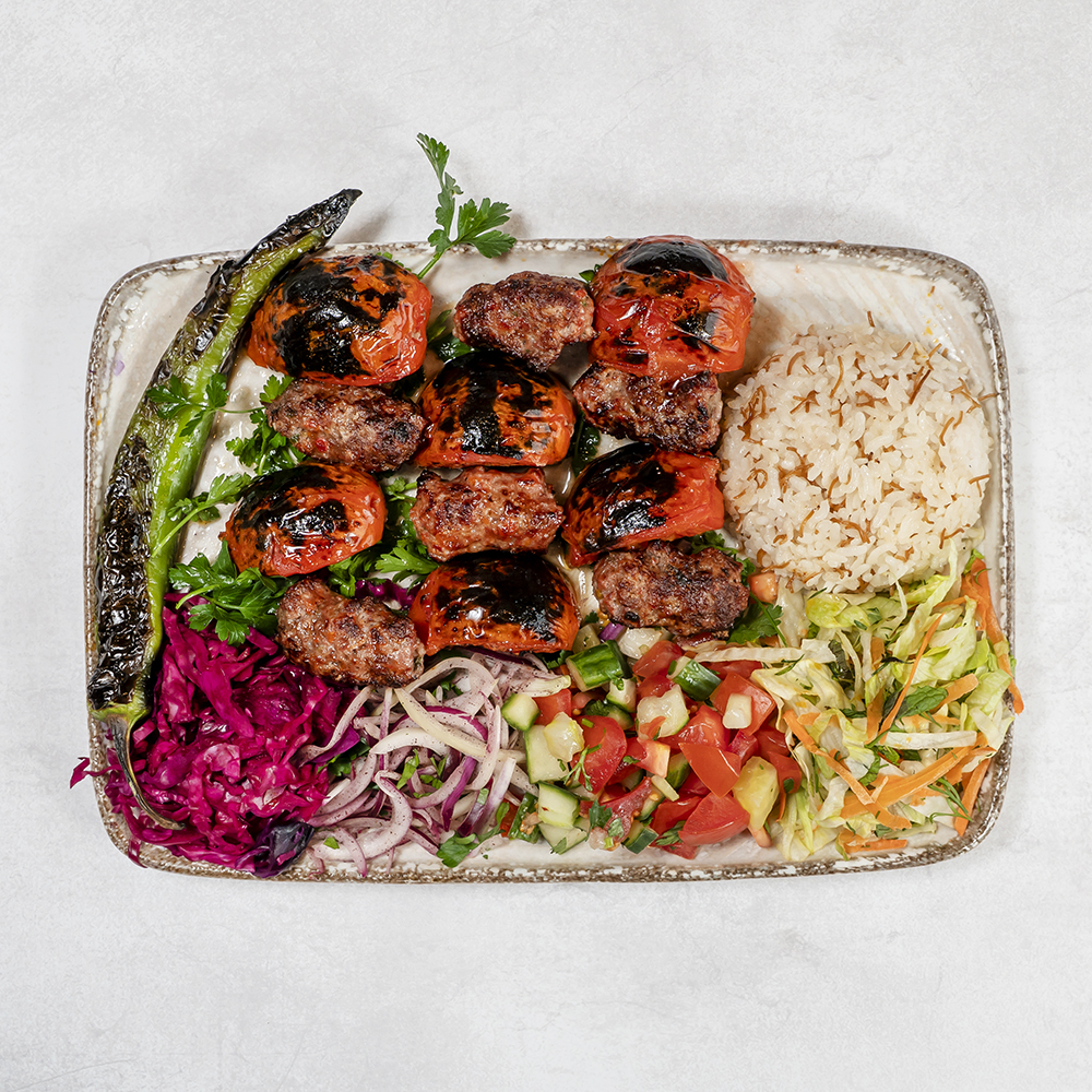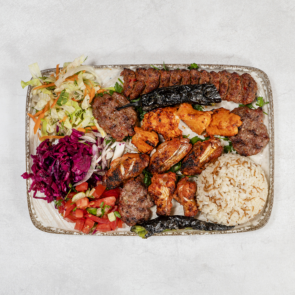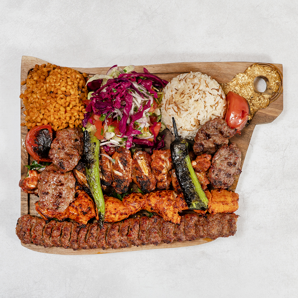 Deska degustacyjna mięs grillowanych : szaszłyk z kurczaka, skrzydełka, adana kebab, döner kebab, kotleciki jagnięco-wołowe, serwowane z ryżem lub kaszą bulgur, grillowana papryka oraz pomidor / Grilled meat tasting board: chicken shashlik, chicken wings, Adana Kebap, döner, lamb and beef cutlets, served with rice or bulgur, grilled pepper and tomato