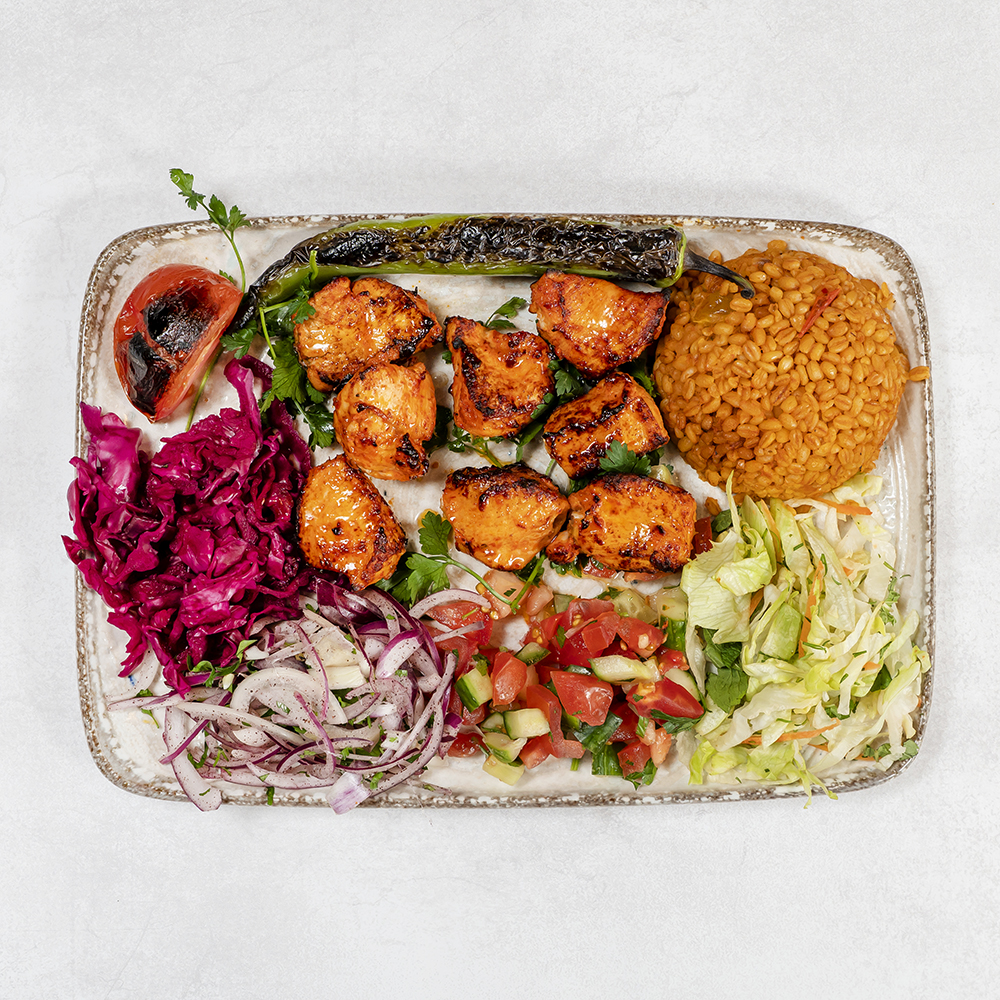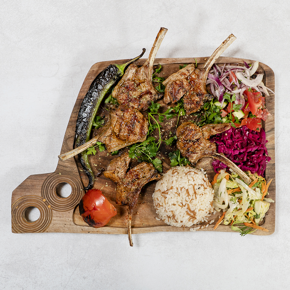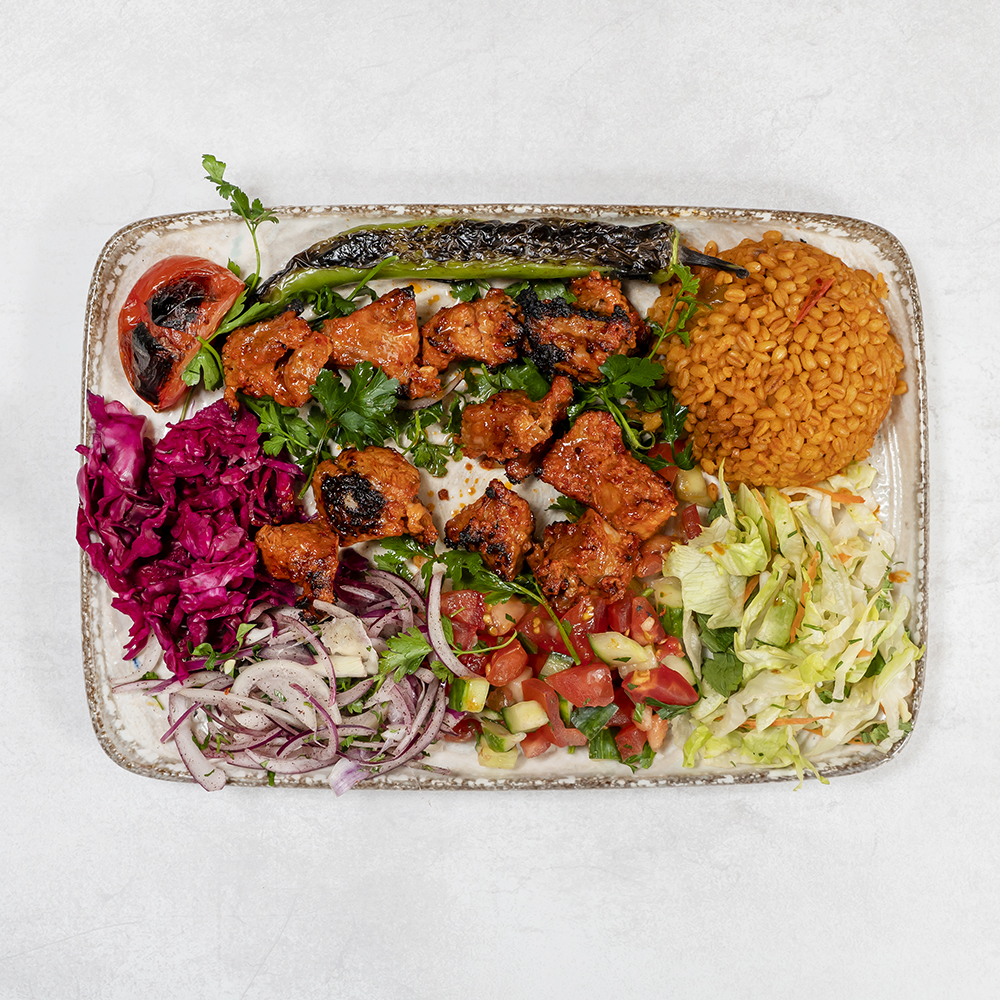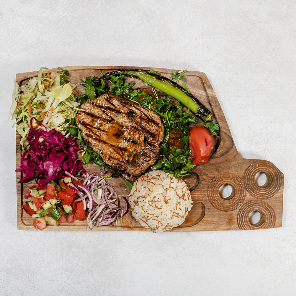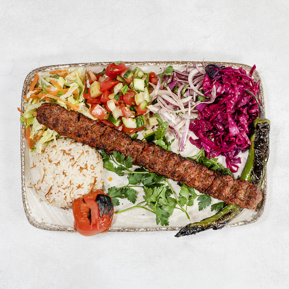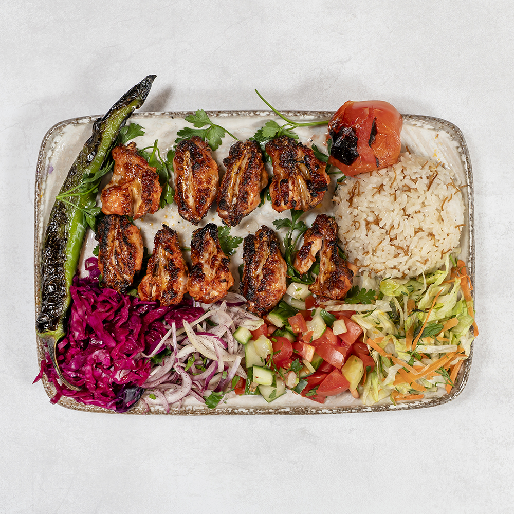 Deska degustacyjna mięs grillowanych : szaszłyk z kurczaka, skrzydełka, adana kebab, döner kebab, kotleciki jagnięco-wołowe, serwowane z ryżem lub kaszą bulgur, grillowana papryka oraz pomidor / Grilled meat tasting board: chicken shashlik, chicken wings, Adana Kebap, döner, lamb and beef cutlets, served with rice or bulgur, grilled pepper and tomato