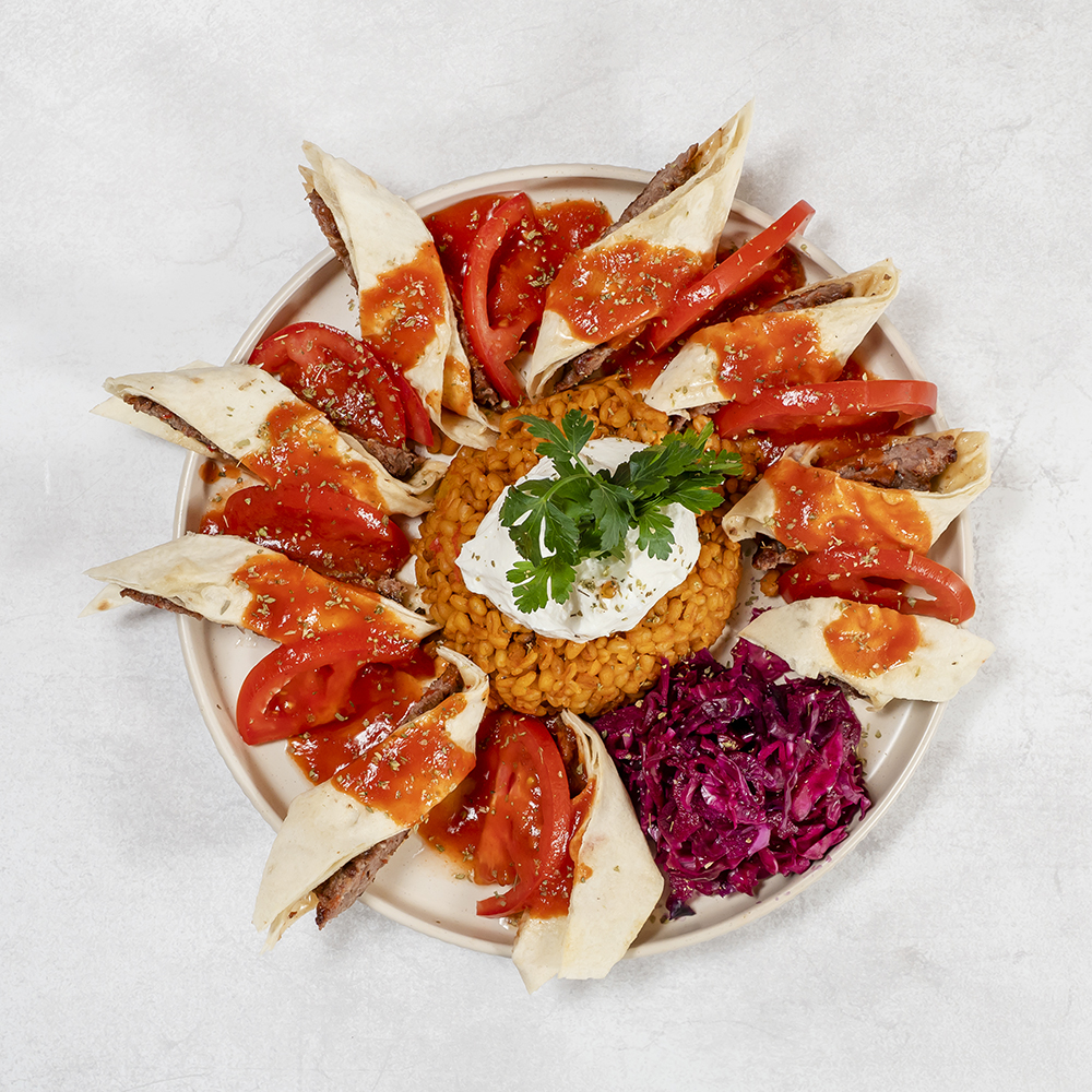 Grillowane mięso jagnięco-wołowe, z dodatkiem czosnku zawinięte w chleb lavash podawane z sosem pomidorowym oraz jogurtem Grilled minced beef-lamb meat with garlic, wrapped in lavash bread, served with tomato sauce and yogurt